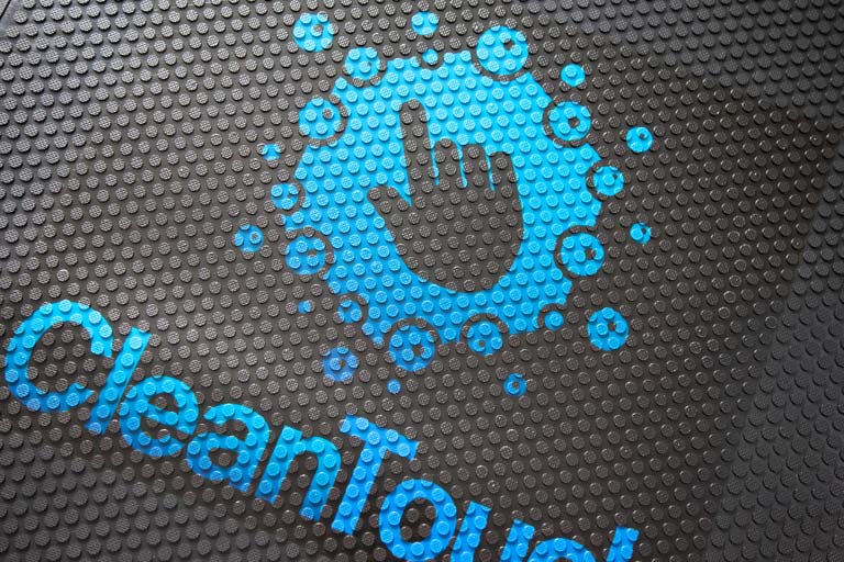 Les tapis SuperScrape comportent votre logo qui est créé en moulant un matériau polymétrique imprimé numériquement dans la surface en caoutchouc durable.
